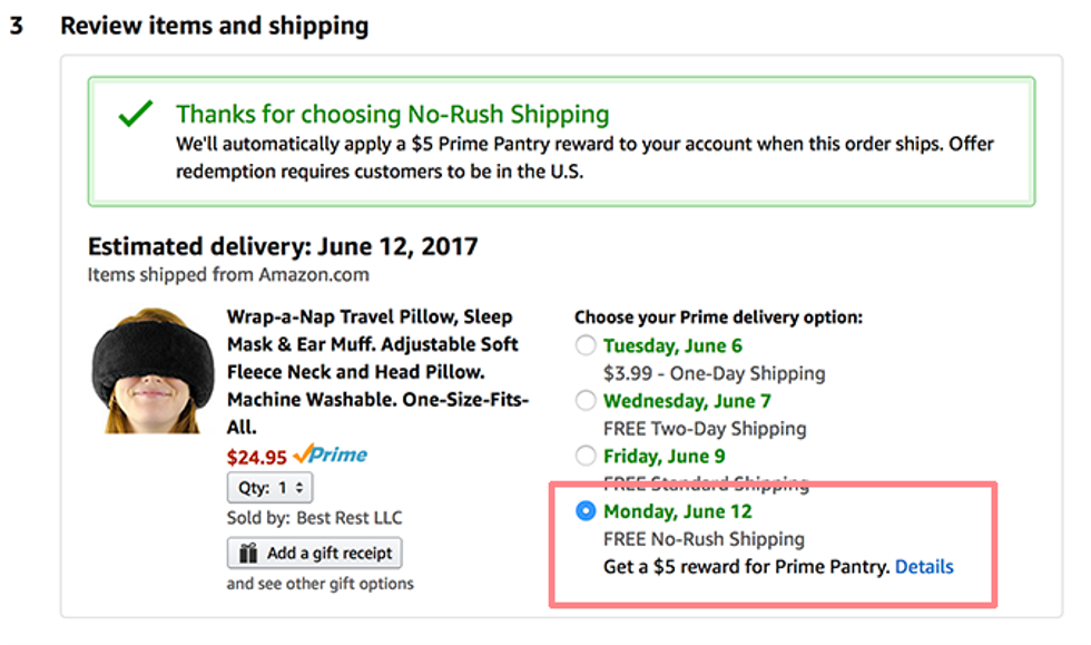 That's why they entice you with a $5 Amazon Pantry credit if you agree to their free "No-Rush" shipping. So if you're not in dire need of your latest order of bulk-pack toilet paper, give it a shot.