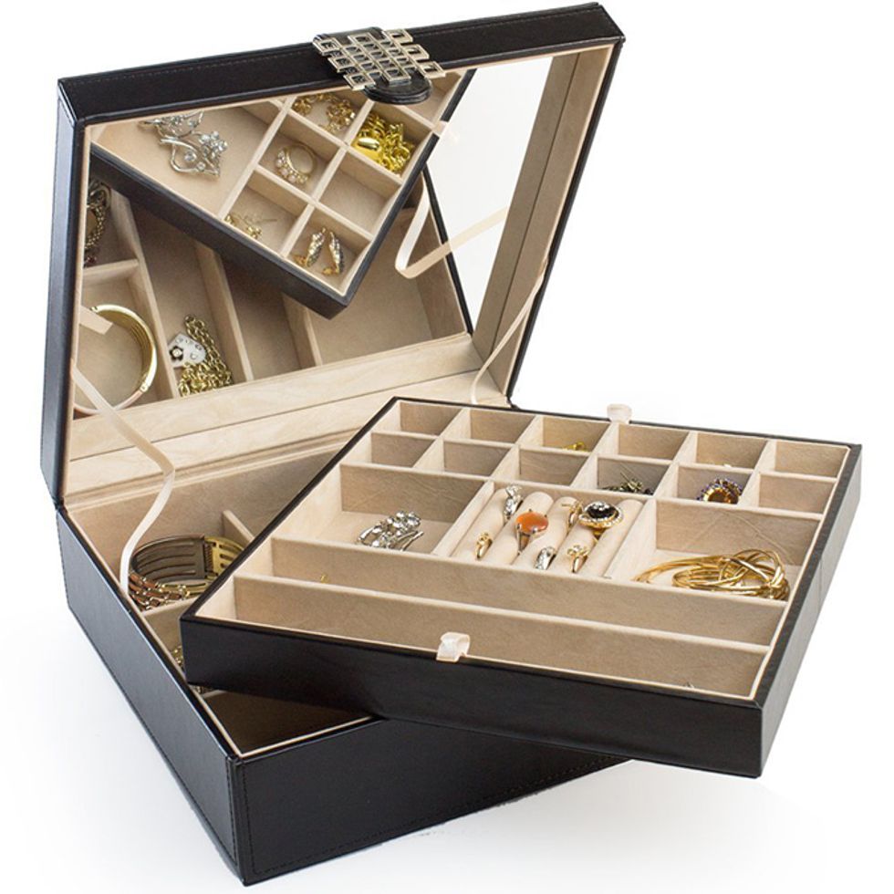 Selected Review: This is a lovely box with two levels. Leather outside with an attractive clasp. Once opened a mirror is revealed that covers both first and second levels. The top layer is where I have placed my rings, there is 4 layer slot for rings. My favorite earrings fill the rest of the slots, except for one favorite necklace. -PrisrobFind it on AmazonThis Mom-centric Coloring Book That Lets Her Know You Know The Struggle Is Real