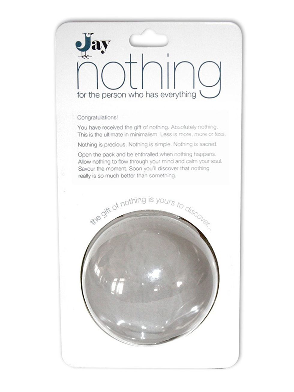 While it may seem useless, The Gift Of Nothing solves one recurring problem: what the heck to buy a dad who has (seemingly) everything. Selected Review:I was thrilled when nothing was delivered. Nothing is all I could've asked for and more. Nothing exceeds my expectations. I would definitely purchase nothing again. I hope nothing lasts a long time. After joining amazon prime, I got nothing delivered to me on a Sunday. Nothing is truly something. My office Christmas party is coming up, and I can't wait to purchase nothing for one of my coworkers! -PalzonFind it on Amazon