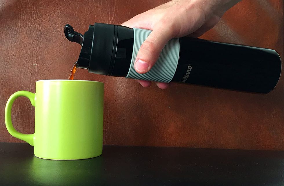 We’ve all found hacks around the limitations of phone speakers, from nifty toilet paper roll rigs to mugs, but they aren’t exactly portable or stylish. This silicone stand fits most iPhones and amplifies sound up to 13 decibels. The megaphone vibes create a visual era clash that turns your phone into an old-timey record player. A Portable French Press Coffee Maker