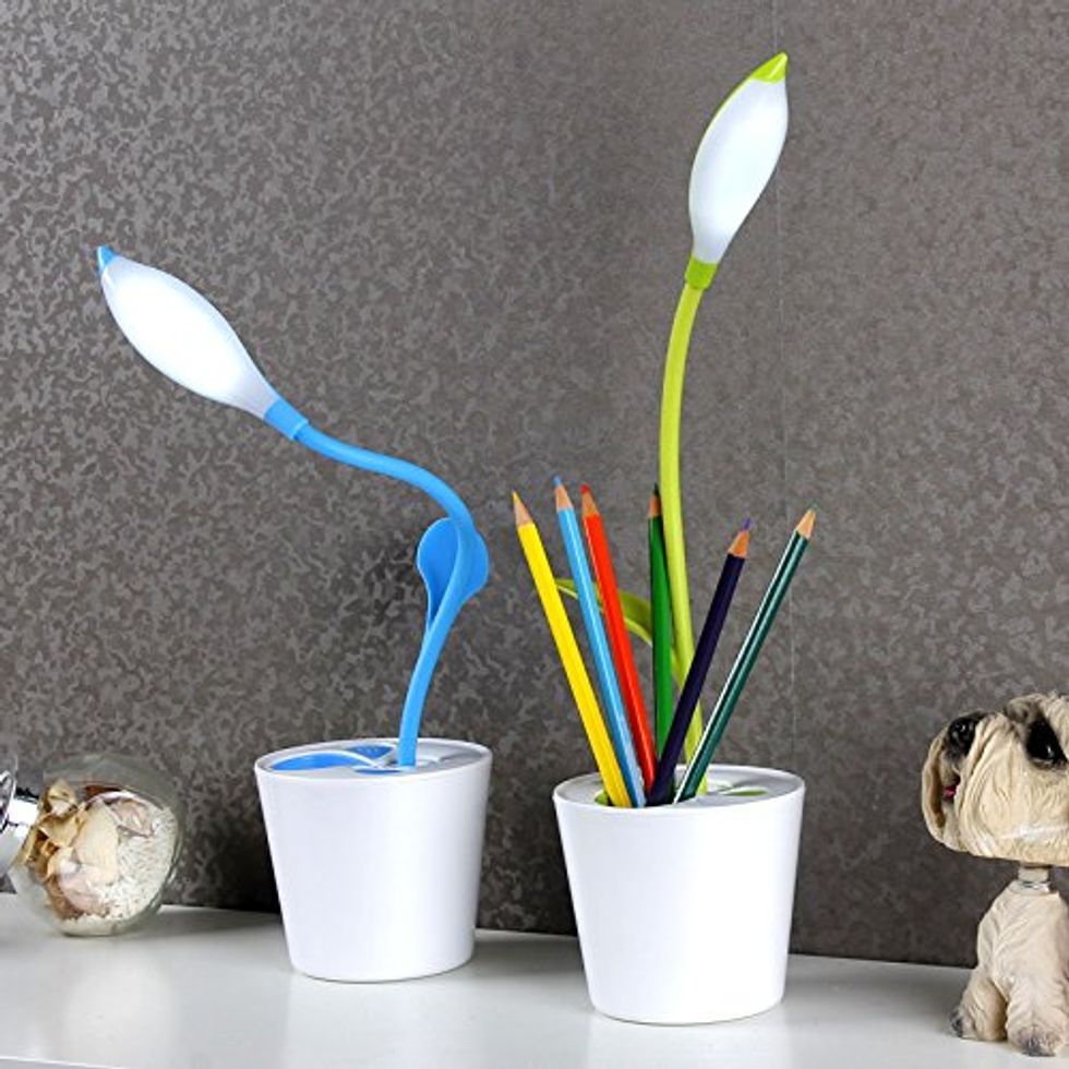 Reduce eye strain and enjoy the funky modern look of this cool lamp all at once! You can bend the "stem" into whatever angle works best for you. This lamp is also dimmable — use the touch-sensitive control switch to adjust between the three different preset brightness levels. It can either be powered via USB or charged up and used away from the USB port. After it's charged, it can provide up to 15 hours of light.This Pencil Cup Provides a Classy Home for Your Writing Utensils