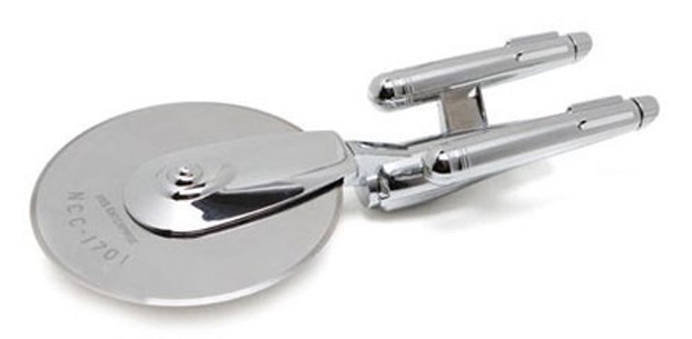 Wow, a pizza cutter shaped like the Star Trek Enterprise is actually a brilliant idea. So many pop culture spaceships have that big, circular center! They should do this for all of them. The Enterprise works particularly well, though, because it is still easy to hold. (The Millennium Falcon would be less so.) This thing’s got a stainless steel blade, so it is made to work. It’s not just a toy. It will really cut your pizza.