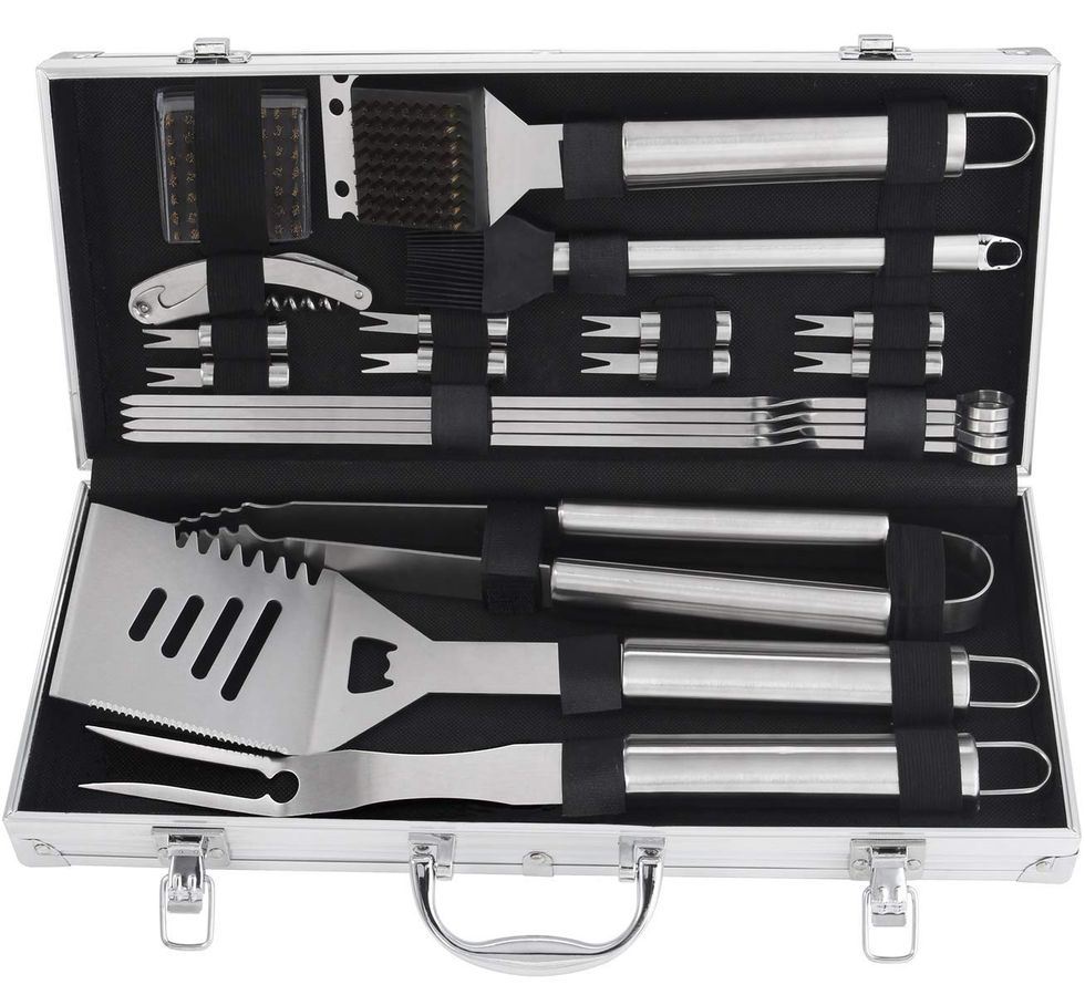 Buy this for your guy or for yourself! This is the last set of tools for grilling that you will ever need. I swear, this set comes with everything! The 20-piece set includes one BBQ spatula, which is actually a 4-in-1 multitool (slotted turner, tenderizer blades, a serrated knife, and a built-in bottle opener), one fork, one basting brush, one tong, eight corn holders, four skewers, one corkscrew, and an aluminum case.
