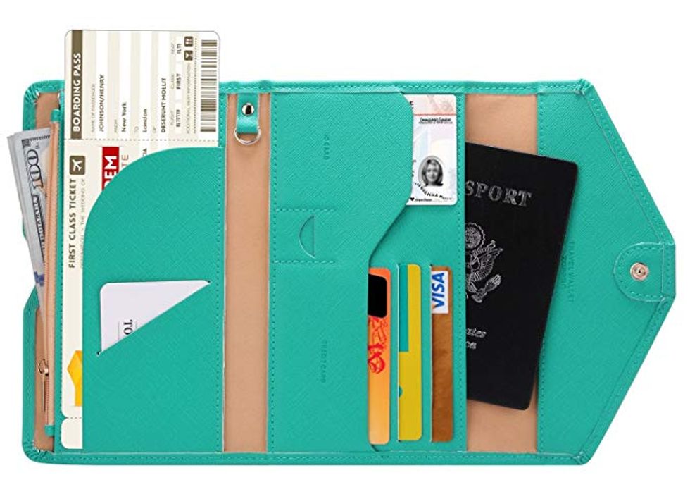 Whenever you travel, it's especially important to keep your information secure. This wallet is made from special RFID-blocking material that will protect your identity and other personal information no matter where you are or who you encounter. It also has so many pockets that are great for keeping everything organized — it even has pockets specifically for your passport and boarding pass!This Is Just a Roll of Pizza Stickers