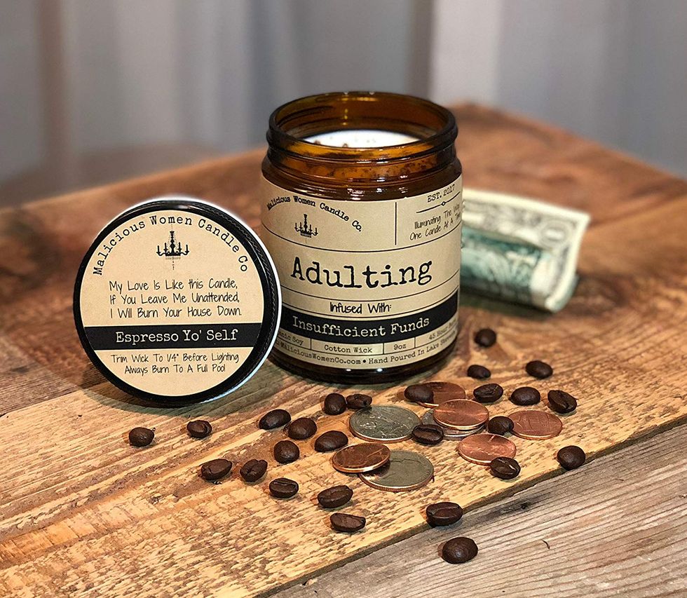 Sure, you could buy regular old fridge magnets for your dog-loving friend, but why do that when these magnets that look just like dog butts exist? This set comes with a poodle butt, a little Scottie butt, a pug butt, a Dalmatian butt, and a golden retriever butt. It even comes with a fire hydrant magnet so you don't get any accidents. How wonderfully thoughtful.This Adulting Scented Candle