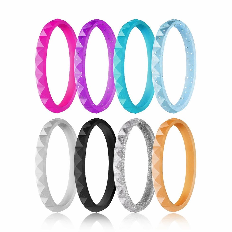 Silicone wedding bands are a really good way to show off your commitment without ruining some fancy stone. They're stackable and really cute and come in all different colors. Some of them are even sparkly!These Cupcake Liners