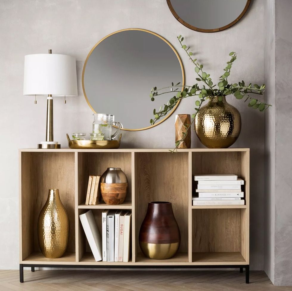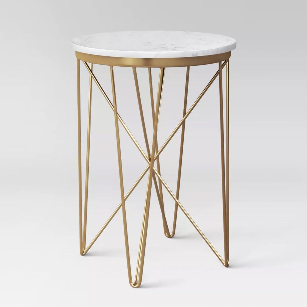 Thank you, Target, for providing on-trend, high-style furniture at big-box prices! This marble top table will look gorgeous in my bedroom with a plant and framed photo on top. Measuring 22.5 inches high and 17 inches in diameter, it works well as a bedside or accent table. It's earned about 400 reviews so far, with 91% of customers saying they would recommend it.This Gold Wall Decor Inspired by Mid-Century Modernist Style