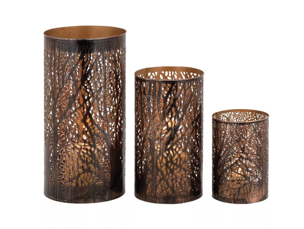 Perfect for patio tables, mantels, or other spots that need a little light, this set of three hurricane candle holders is an affordable way to add instant, rustic style to your home. The candle holders are made of iron, oil-rubbed to a golden-bronze color, with a subtle tree branch pattern that allows the light to escape. The tallest is 12 inches tall, and together they weigh 2.5 pounds.This Wall-Mounted Shelf Inspires Creative Decorating