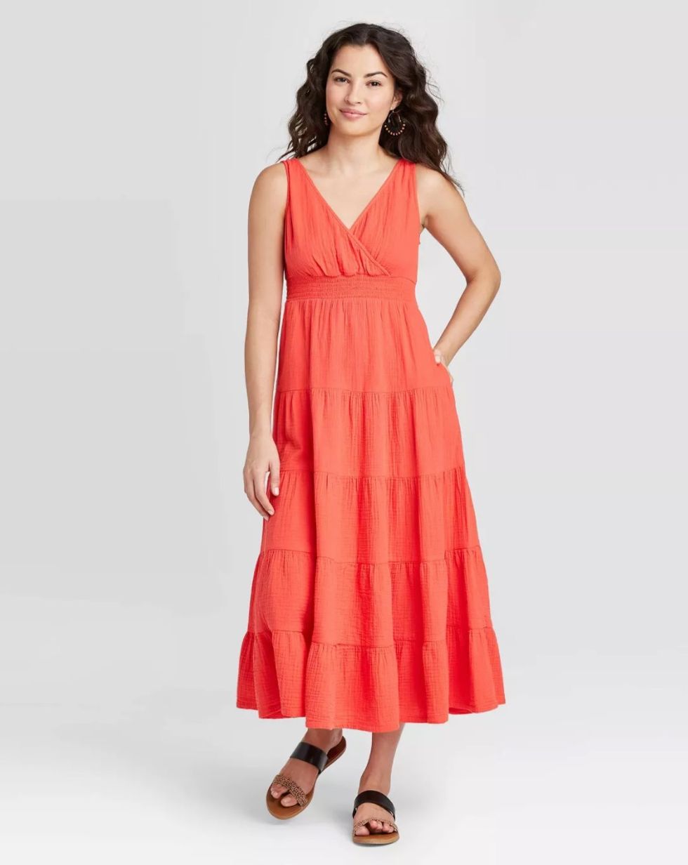 Perfect for walks on the beach or neighborhood ice cream runs, this straw tote bag makes me feel all the sweet summer vibes. It's a versatile medium size with a fabric lining in a warm bronze tone that complements the natural straw fibers. The trendy tassel adds additional color and texture.This Tiered Cotton Maxi-Dress for Staying Cool on Hot Days, Indoors or Out