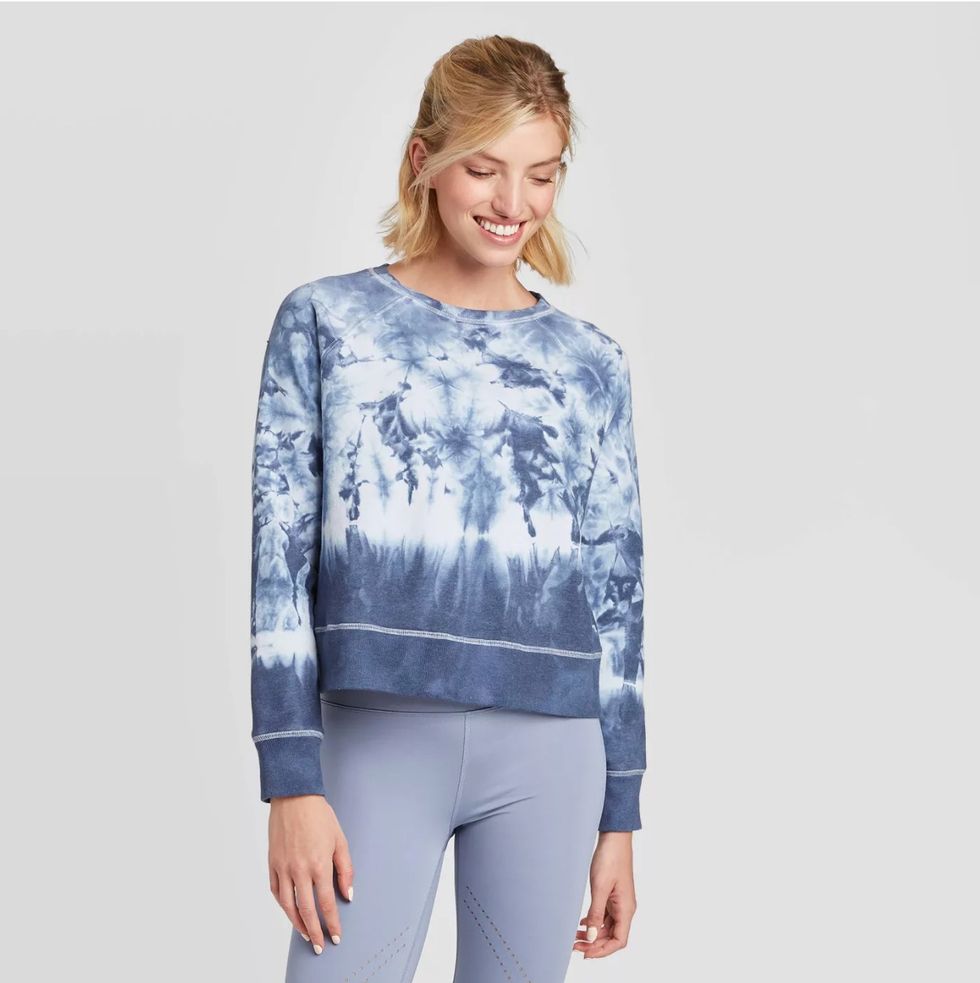 Tie-dye comes and goes in fashion, and right now it's back in a big way. I'm loving this light-weight sweatshirt perfect for post-workout, morning walks, or lounging around the house. It comes in four colors (the blue tie-dye is my favorite) and six sizes. It's a cropped length, which looks great with high-waist pants or layered over a long tank top.These Tie-Waist Shorts for a Cute, Cool Look