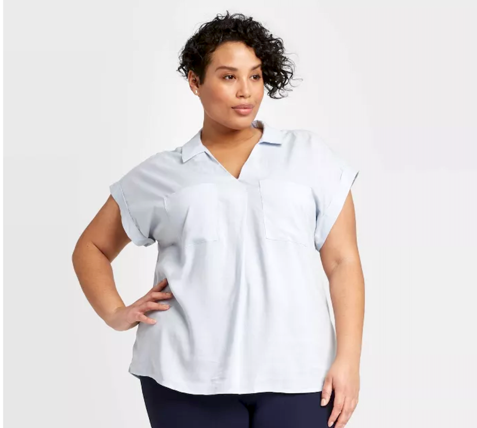 I love Target's stylish basics like this breezy blouse that'll become your new work wardrobe workhorse. It comes in a few pretty colors - the blue has my heart - and looks just as good under a blazer as it does on its own.This Camo Jacket Is So Hot Right Now