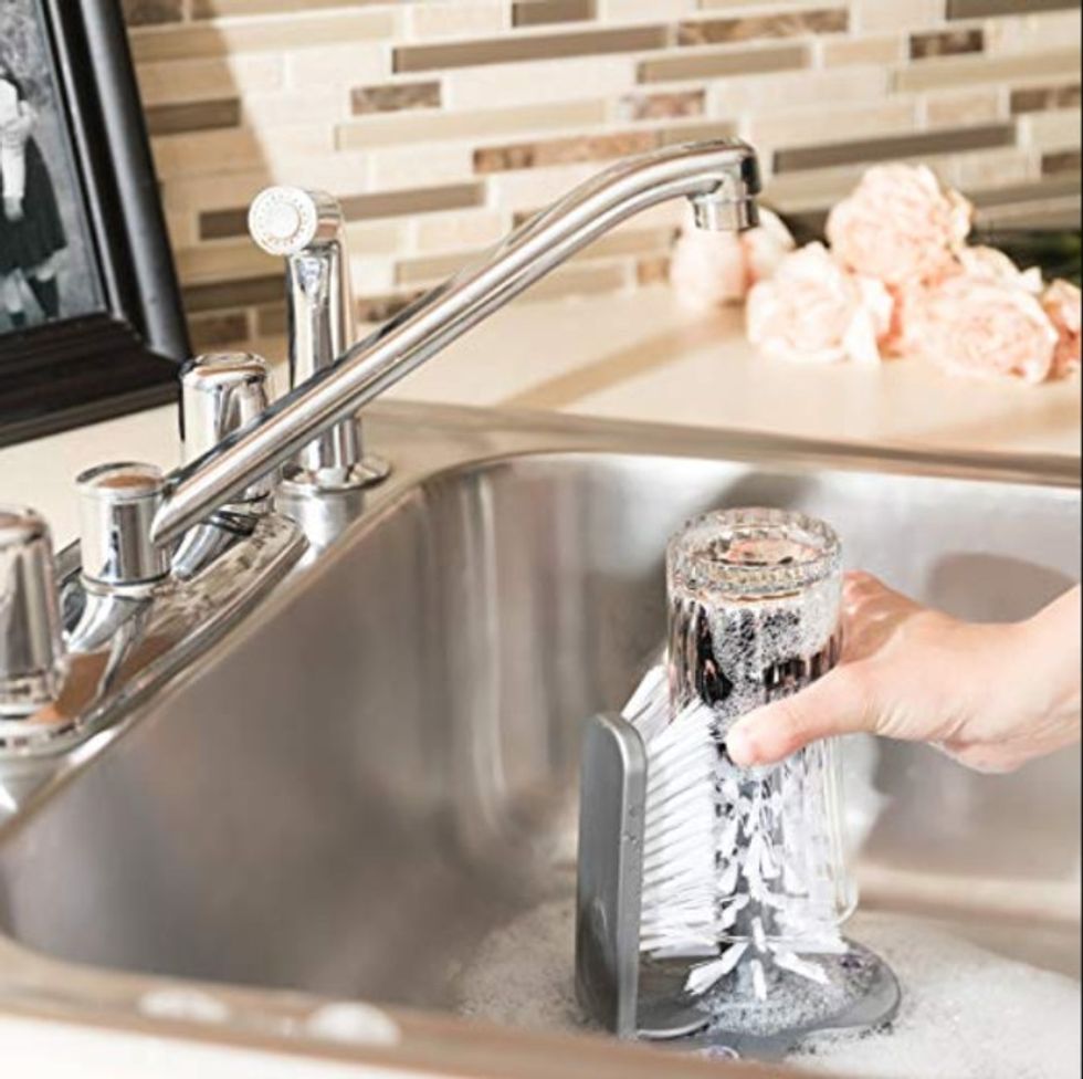 Sticky adhesives on glass or plastics, hard water stains, and dried paint on your windows or switch plates are no match for the Scrigit Scraper. This handy cleaning tool can also reach into otherwise unreachable places.This Glass Washer Brush Affixes to the Bottom of Your Sink With Suction Cups and Makes Cleaning Glassware a Breeze