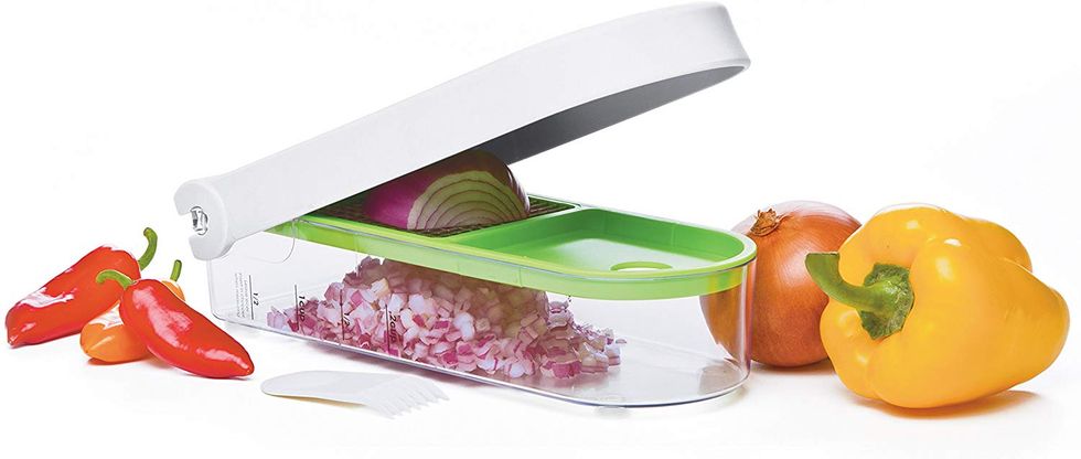 I work at home and watch my 6-month-old son by myself during the day, so when I make dinner before my husband gets home I bring him into the kitchen with me. This usually works out fine, unless I need to chop an onion, which forces me to put him all the way on the other side of the house so his eyes won't get burned. But this onion chopper not only avoids the whole sore-eye problem, but it also takes literally two seconds to chop an entire onion. Buy one for anyone who owns a kitchen.These Flashlight Gloves That Have A Million Uses