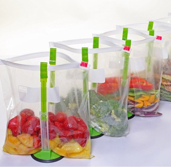 Instead of standing there carefully balancing your near empty container, your funnel, and your new container, the Smart Funnel clips onto both containers. With the funnel securely attached, you can step away and do anything other than wait for that slow moving process to finish.The Baggie Rack is Like Having Four Hands