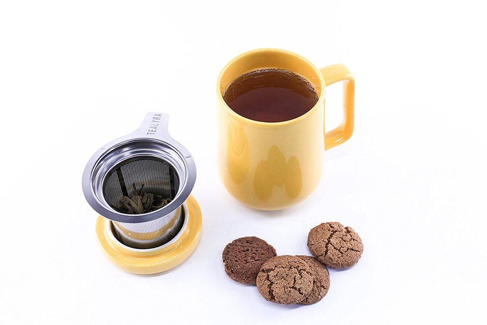 The ceramic mug includes a lid and a little infuser basket. When you're done steeping your tea, the lid can be flipped over and used as a tiny coaster for the basket.This Mini Humidifier Is Totally Portable