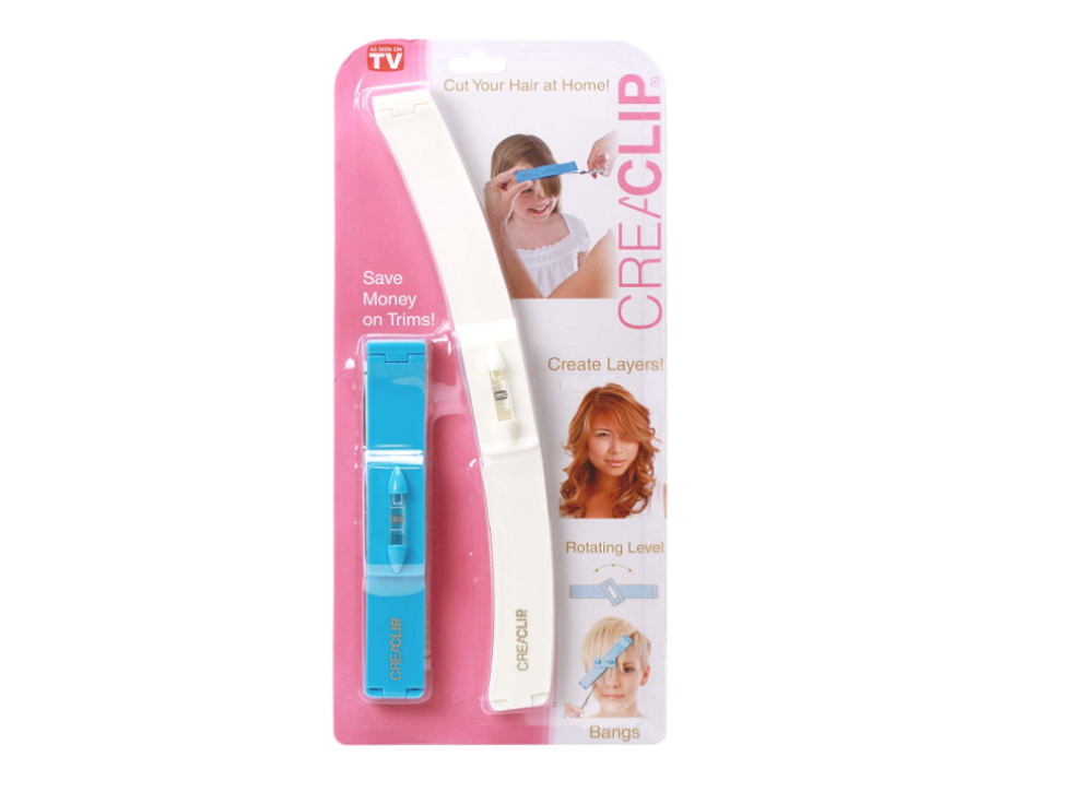 You don't have to walk around like cousin IT when the salon is closed — just trim your bangs with this guide clip. You can also use it to trim your ends, and it's almost too easy to use: just clip, side, then cut your strands. The built-in level ensures that your hair is trimmed evenly, and each order comes with two.