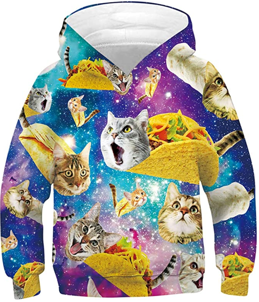 I'm sure there are quite a few adults wishing this taco cat hoodie came in their size, but it's only for kids! The bright bright print will stay that way through whatever your kid can put this sweatshirt through so they'll look purr-tastic wear after wear.
