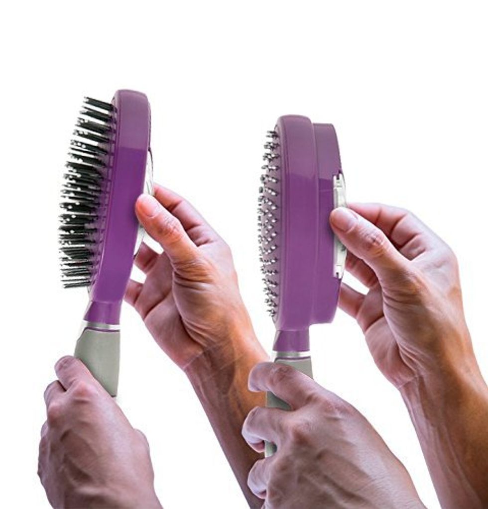I always have a tough time cleaning my brushes, and scraping those bits of hair and fuzz out of the bristles takes much longer than it should. This brush makes it easy to have a clean-brush without a struggle. Squeeze the buttons to retract the bristles, and pull out all that extra-hair easily. Plus--it's a nice brush, too! It gets my hair looking sleek right away.