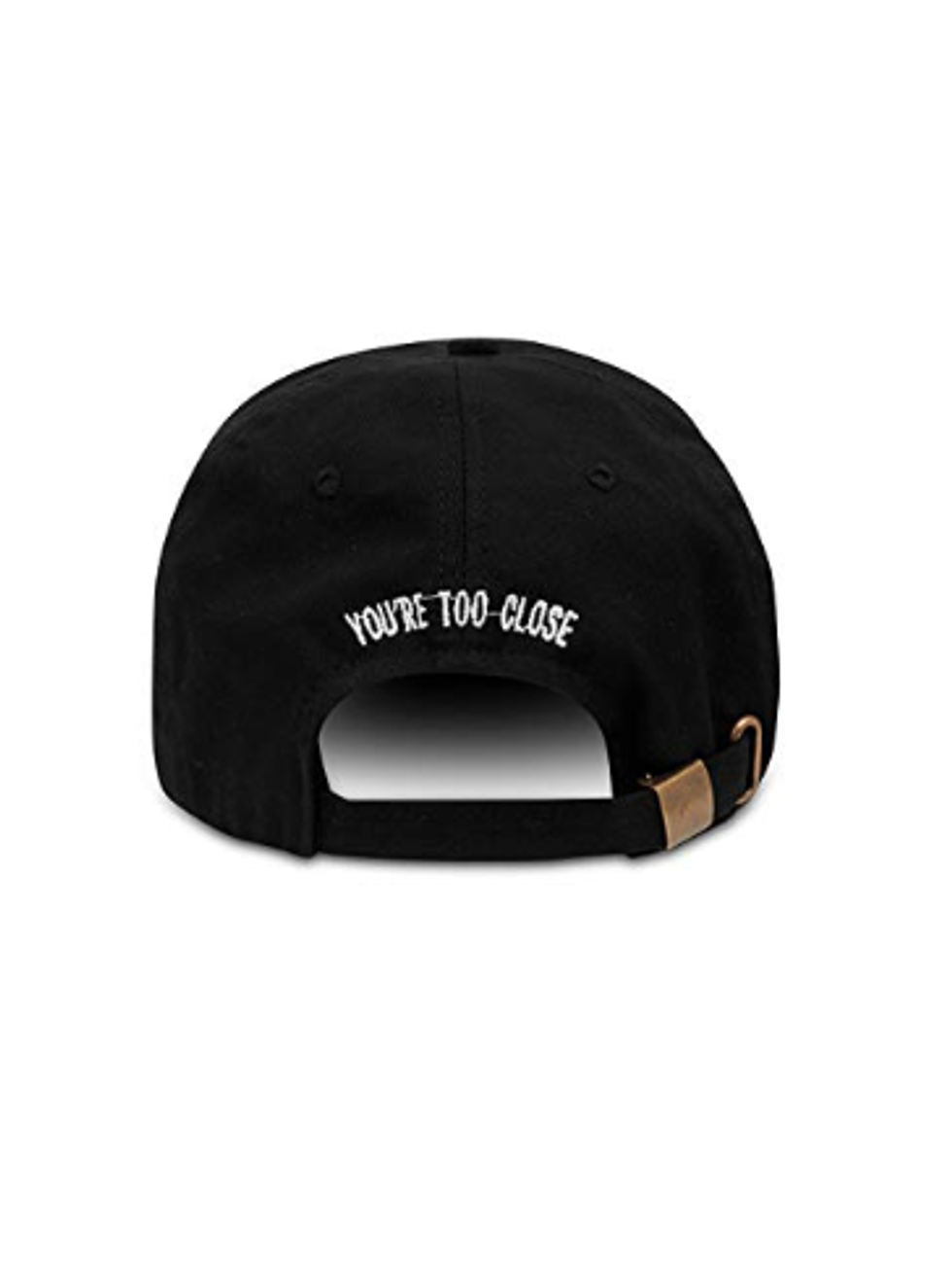 I love this baseball cap. It's plain black in the front, but on the back, it says, "You're too close." If someone's reading it, they need to get away from you.This Pug Tape Measure