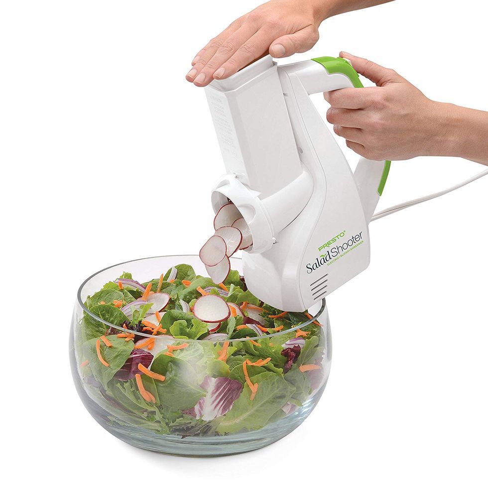 This might be the most fun kitchen appliance I've written about. Load any ingredient into the Salad Shooter to slice or grate it directly into the pot or bowl. Add one ingredient after another without cleaning or changing anything in between. It's ideal for layering veggies in a salad, topping a pizza, or chopping nuts and chocolate for baking.This Selfie Massager Helps You Help Yourself