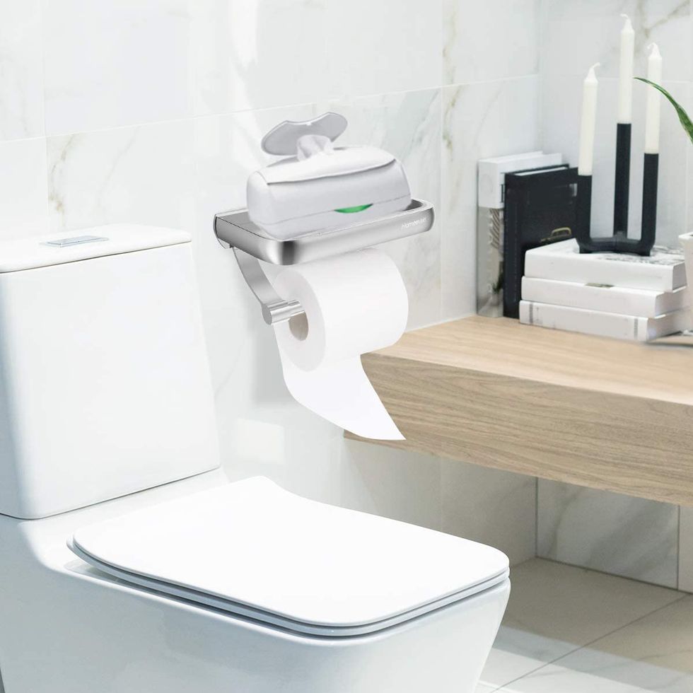 There's always some sort of gobbledy-gook on your sink faucet, so why not make it touchless with this adapter? Now whenever I wave my hands underneath, the water starts running immediately — no contact required. And because the battery lasts for more than nine months, you hardly have to worry about charging it.This Toilet Paper Holder With A Built-In Shelf
