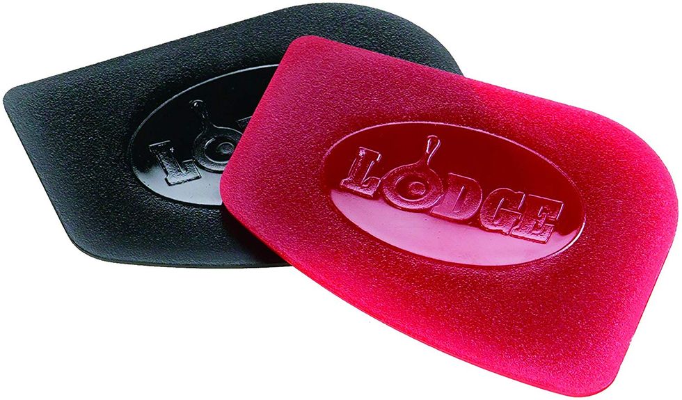 We have these cast iron pan scrapers from Lodge and use them a few times a week to clean my hub's prized collection of pans (ok, two, but who's counting?) They effectively get the gunk off without removing that precious polymerized coating that's key to skillet cooking.This Ladies' T-Shirt Is Effortless Fashion