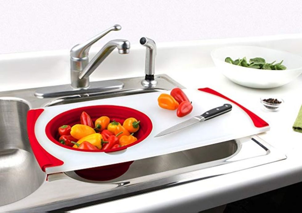 Cleaning an oven is arguably the worst chore ever. Also horrible is when there's some mystery thing baked onto the bottom of your oven creating a smokey disaster. Avoid all of these terrible things with a set of Oven Liners. These non-stick, reusable liners can be removed and wiped clean super easily. Use them in electric or gas ovens, in toaster ovens, or even as grill mats!This Over the Sink Strainer Board is the Most Convenient Way to Wash and Chop Your Fresh Produce