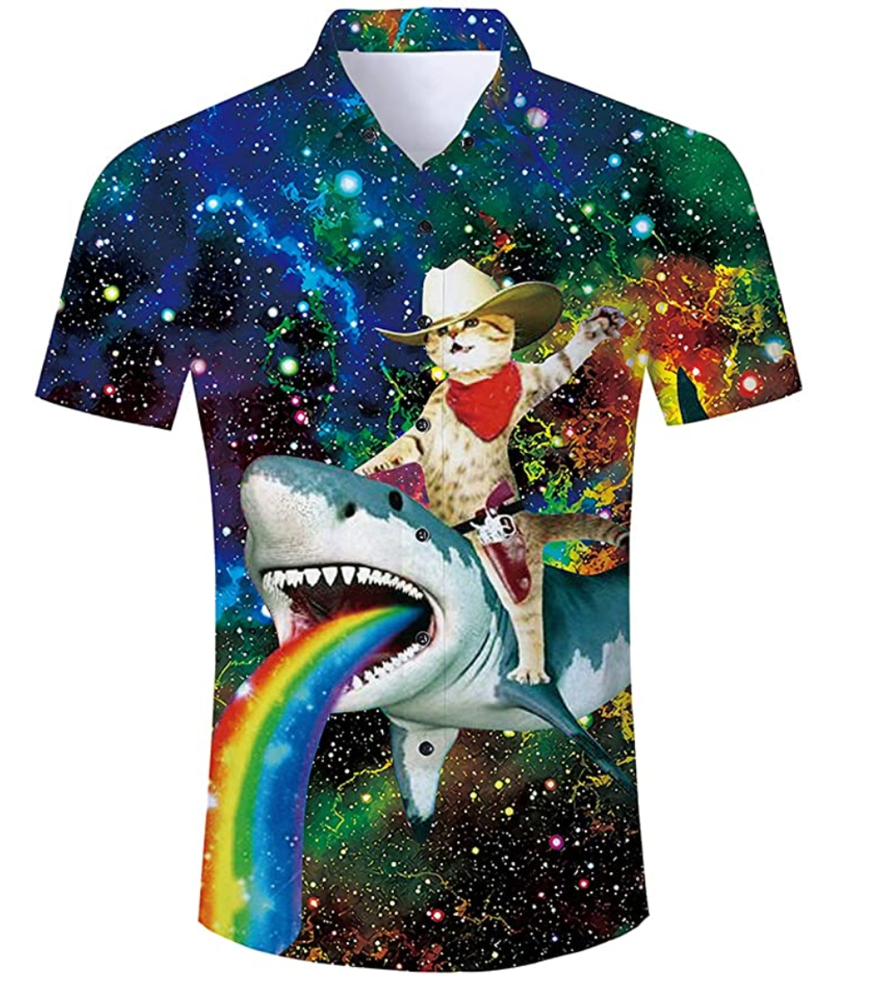 A Button-Up Shirt Featuring A Space Cat Riding A Shark