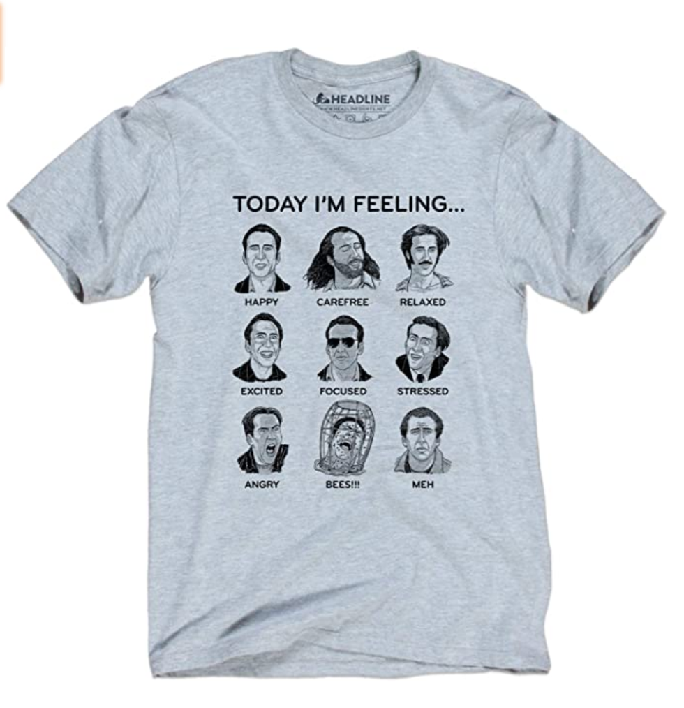 Some days I'm feeling happy, other days I'm feeling BEES!!! — but since those emotions can be difficult to put into words, I make sure to wear this Nicolas Cage T-shirt to help get my point across. While some themed shirts can be rather cheap feeling, this one is printed on premium, lightweight cotton with a tag-free neckline.