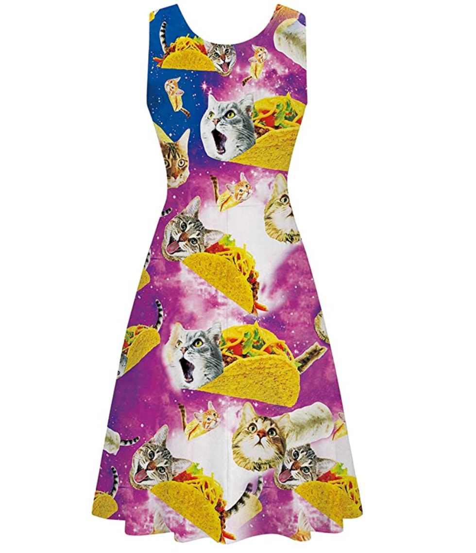 Adult clothes don't have to be boring — a prime example being this taco kitten burrito dress. It has a flattering A-line cut that looks good on literally anybody, plus you can easily dress it up or down with heels, flip flops, or even a belt around the waist. Unlike other printed dresses, I've been able to put this one through the wash multiple times without any shrinkage.