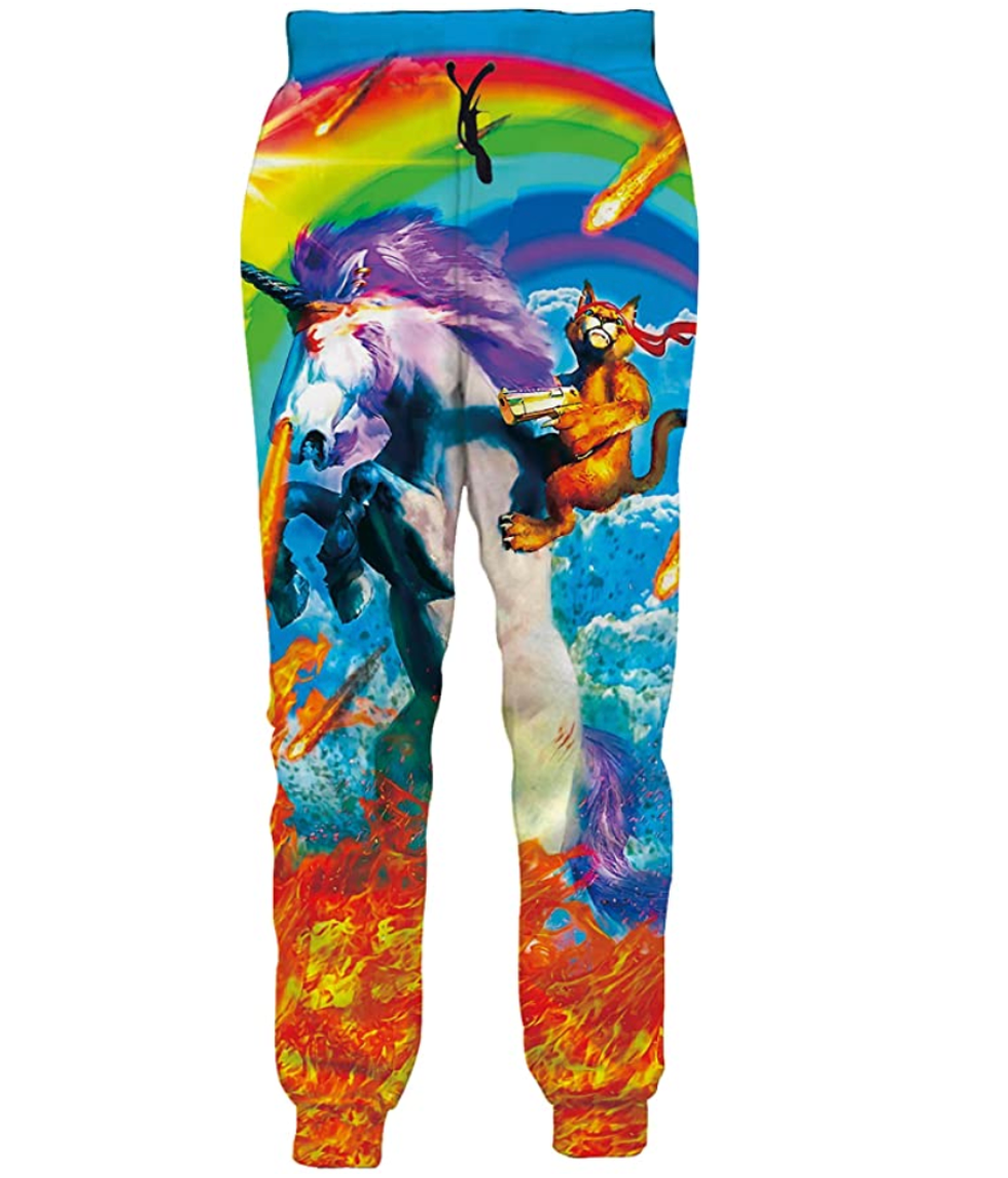 If you don't think these cat riding a unicorn joggers are sick, then I'm sorry — you can't buy them! No, that's not a thinly-veiled attempt at reverse psychology, it's just the rules. They fit true-to-size so you don't have to worry about sizing up (unless you'd prefer a baggier fit), and one reviewer even wrote about how they're "very comfortable — silky on the outside and very soft on the inside."