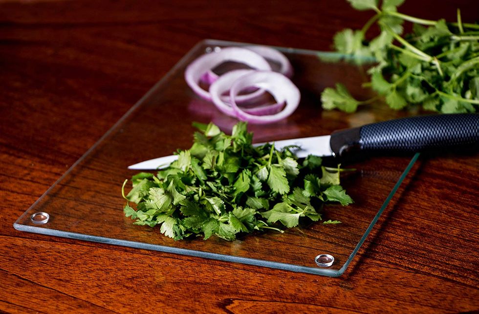 Glass cutting boards are pretty spectacular. You get the hardness of a wooden board without the porosity of wood or plastic boards. Germs can’t get into the grooves and contaminate future meals. Non-slip pads on the bottoms of this cutting board set to prevent them from sliding around. The shatterproof glass can handle your knives and heat so you can also use the boards as trivets.