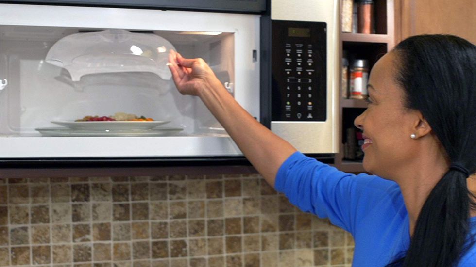 I firmly believe that every single office microwave should come with one of these things. It's a splatter guard that you can use in the microwave to keep food from ending up all over the inside of the oven. But that's not the best part. It has magnets embedded at the top which allow the Hover Cover to be stored inside the microwave oven whenever you're not using it.This Cutting Board Is Also a Colander