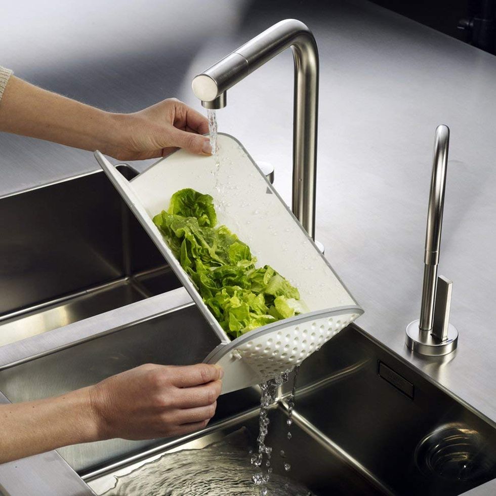 Haven't you always wanted to use your origami skills in the kitchen? Of course you have. When laid flat, the Rinse and Chop acts as a cutting board — nothing too out of the ordinary there. However, fold it up and it becomes a colander you can use to easily wash or drain your freshly chopped veggies. Once again, it means fewer dishes for you to wash, so it's obviously a wonderful invention.This Adjustable Rolling Pin Is a Must for Bakers