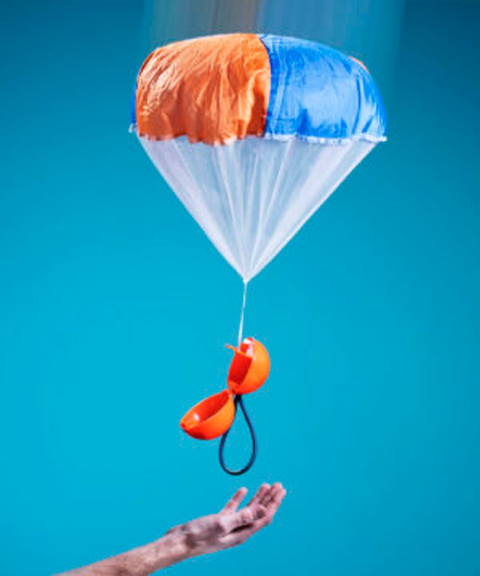 Encourage kids to save money with this Panda Bank, a motorized coin savings bank that's not only practical, but irresistibly cute! Place a coin on the bamboo dish, press down, and watch as the panda slowly peeks out and grabs the coin to slide it safely inside the box. A secret door on the bottom can be opened to retrieve coins later.Launch the Parashoot Up to 80 Feet