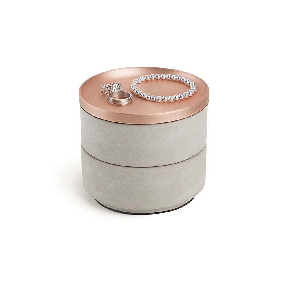 This is like a jewelry box for the most boho chich person you know, which could very easily be you! It has got two perfect concrete tiers with a shiny copper top. It's great for bracelets, necklaces, earrings, rings, basically all your jewelry. And the lining is velvet so you don't have to worry about scratching or anything like that. The lid also doubles as a ring dish! How cute is that?This Portable Charger