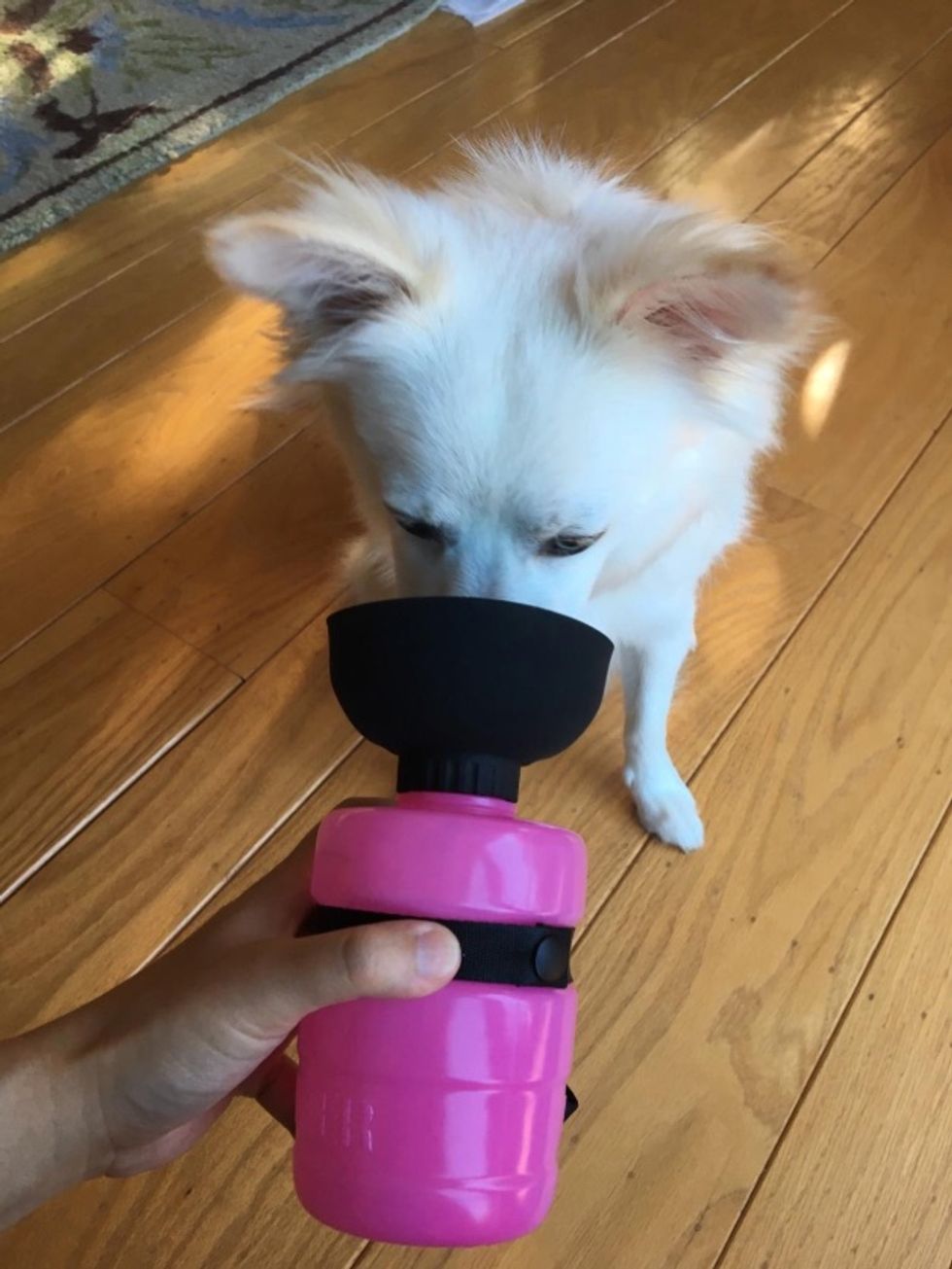 The design of this water bottle for dogs is sheer genius. The 18-ounce bottle has a flexible silicone cap that folds over the top of the bottle. When your dog needs a drink, unfold that flap to form a little bowl that you can squeeze the water into. When done, fold it back, tighten the lid, and you're ready to go.