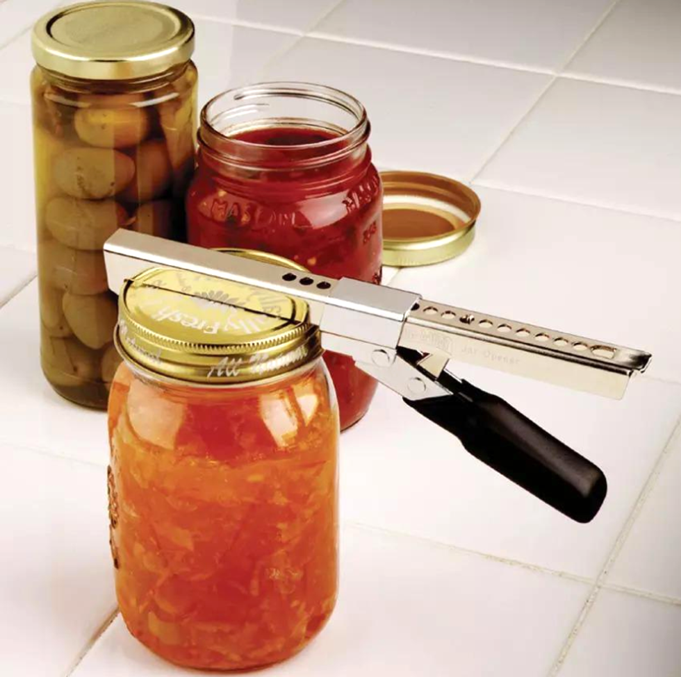 Sometimes it feels like you need superhuman grip strength to open stubborn jars when you just want some jelly with your peanut butter, for chrissakes! Now you can easily thwart stuck jars on the first try with this jar opener that adjusts to fit lids large to small.