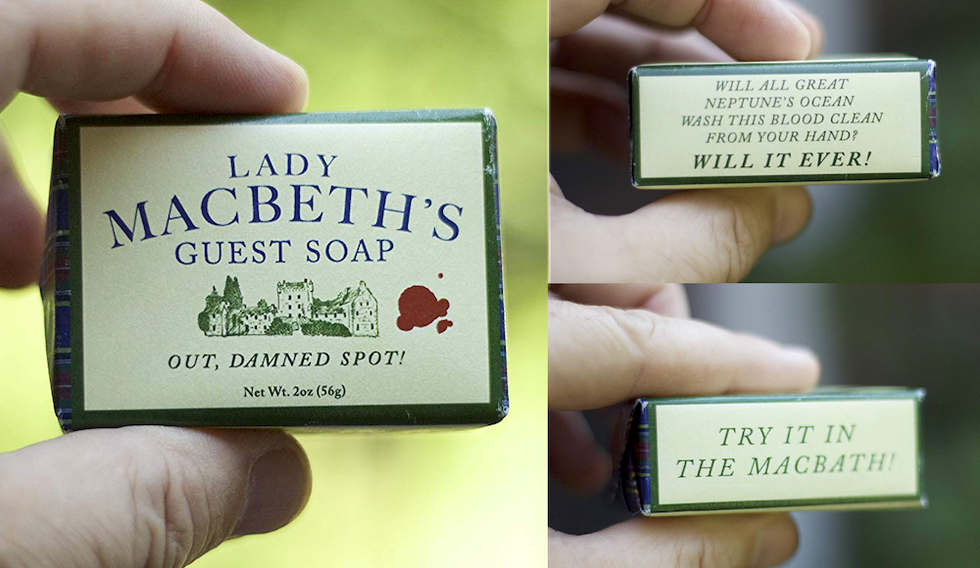 As a former English major, this witty soap makes me giddy ("Try it in the MacBath!) Not into Shakespeare? No problem, it also comes in a million other themes including Nihilism, which smells like nothing, obvs; Mister Rogers, with a fresh milk and cocoa butter scent; and Freud's Wash Fulfillment, which smells like garden cucumber and olive oil...make of that what you will.