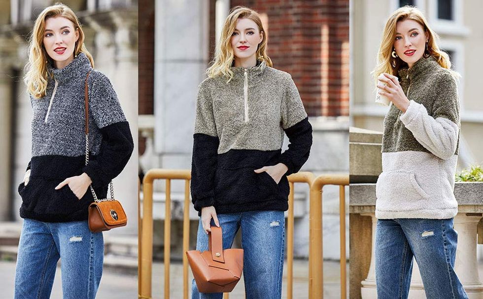 I wish I looked half as good as this lady when I'm schlepping around town, but at least I can have her amazingly soft sherpa jacket! It comes in a bunch of cool neutrals that look great with anything from jeans to uh, black jeans? Seriously though, this is a highly-rated comfy but stylish jacket that should be in any mama's wardrobe.