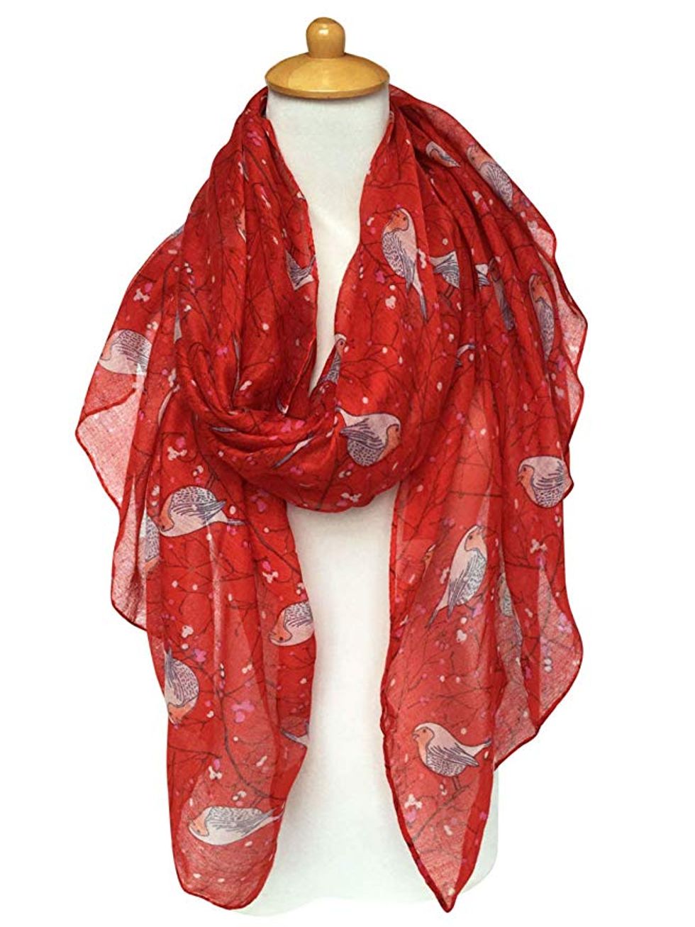If you're looking for a gift for me, you won't go wrong with a pretty Lightweight Scarf. They are the perfect outfit accessory to help bridge the seasons and survive the arctic air conditioning that everyone else seems to like all summer. I never go to a movie or a restaurant without a light scarf in case it's cold. And it's always cold. Who are all these moviegoers who like to freeze for three hours? Would my husband think I have enough scarves? Yes. Is he wrong? Also yes. This lovely red one with little birds on it would be a perfect addition to my scarf collection.