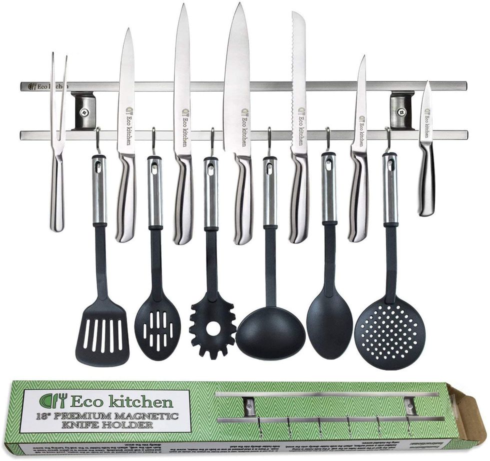 As a grown AF human, you're going to have a fully stocked kitchen. But stocked doesn't have to mean cluttered when you have this magnetic knife rack that has space for your whole knife set plus frequently used kitchen tools and utensils. The super slim design comes in three sizes and attaches easily to your wall, plus it comes with six hooks to hang tools from. And it's got over 1,000 rave reviews for great looks and strong magnets that hold on to knives with an iron grip.