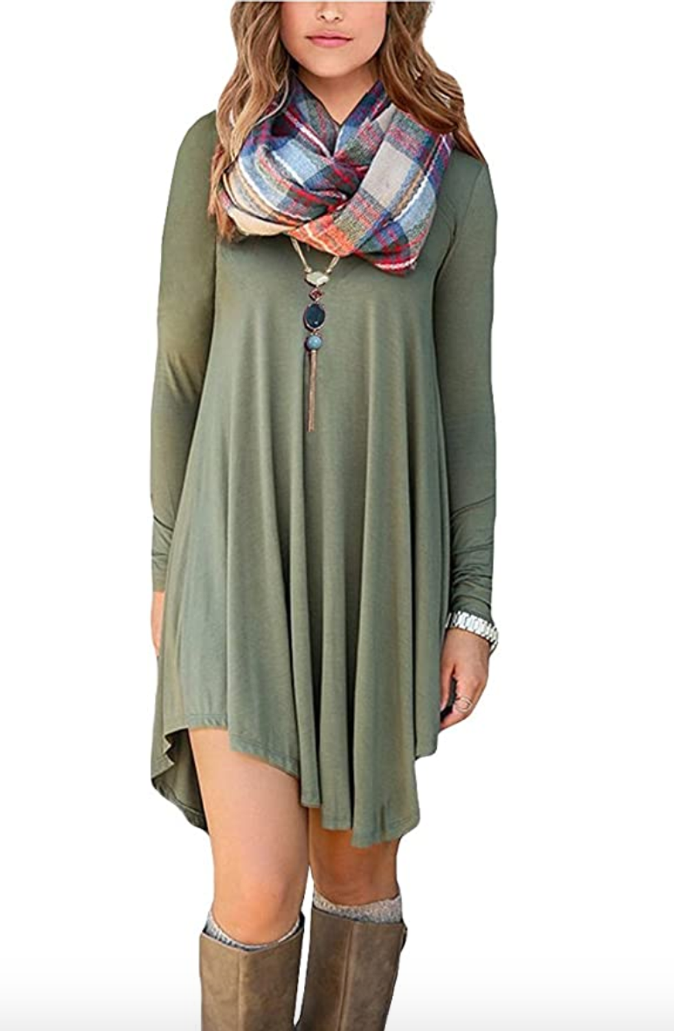 Grown ladies have a few style tricks up their sleeves, one being this long-sleeve tee shirt dress because it's so versatile. It's key to have a few pieces in your wardrobe you can rely on to look good for multiple occasions and this dress is just one of those. You can style it like shown for a cozy fall look with tall boots and a blanket scarf, but you could also just as easily dress it up with heels and a statement necklace or earrings for dinner out. And since it comes in a ton of colors, you can have a few on hand so you'll always be prepared!