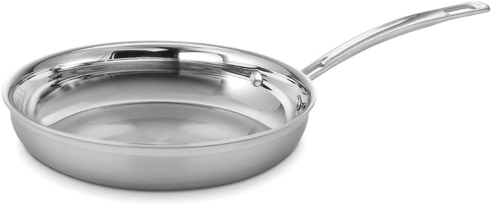 Cooking with a non-stick pan is a no-no when you're making steak, chicken, or any other type of meat — a stainless steel frying pan like this one is the preferred pan to use. The triple-ply stainless steel construction distributes heat evenly throughout the pan, and unlike non-stick pans, it lightly adheres to the surface of your meats. This allows you to get a heartier sear, and as long as the pan is hot enough, your meat won't stick.