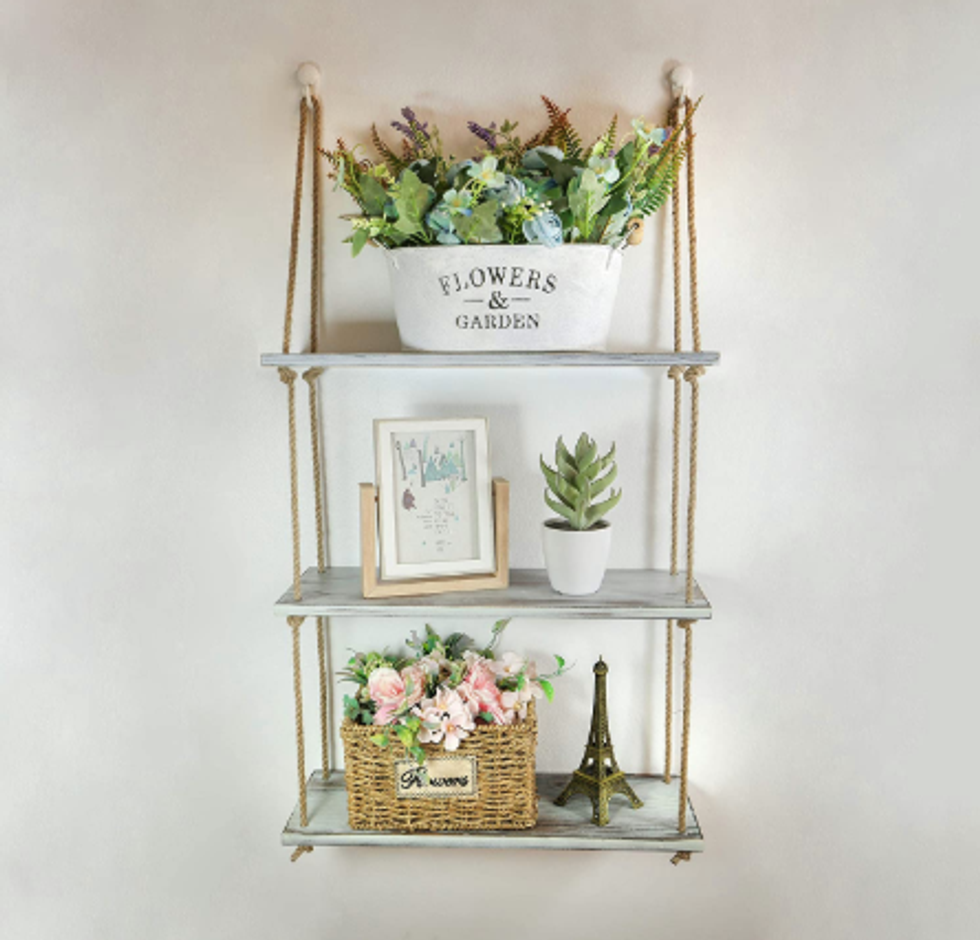 No need to drill into the wall for this hanging shelf — it uses rope to give it a rustic feel. Throw on some cute succulents or picture frames and you have a whole new vibe for your bedroom, living room, or even bathroom.