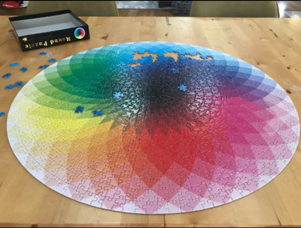If you haven't completed a puzzle in a while, I highly recommend it! It's such a satisfying way to spend a couple hours — it's also the perfect time to catch up on podcasts or an audiobook! This 1000-piece puzzle forms a circle when it's complete. The rainbow gradient is absolutely lovely — you might even want to frame it once you're done putting it together!