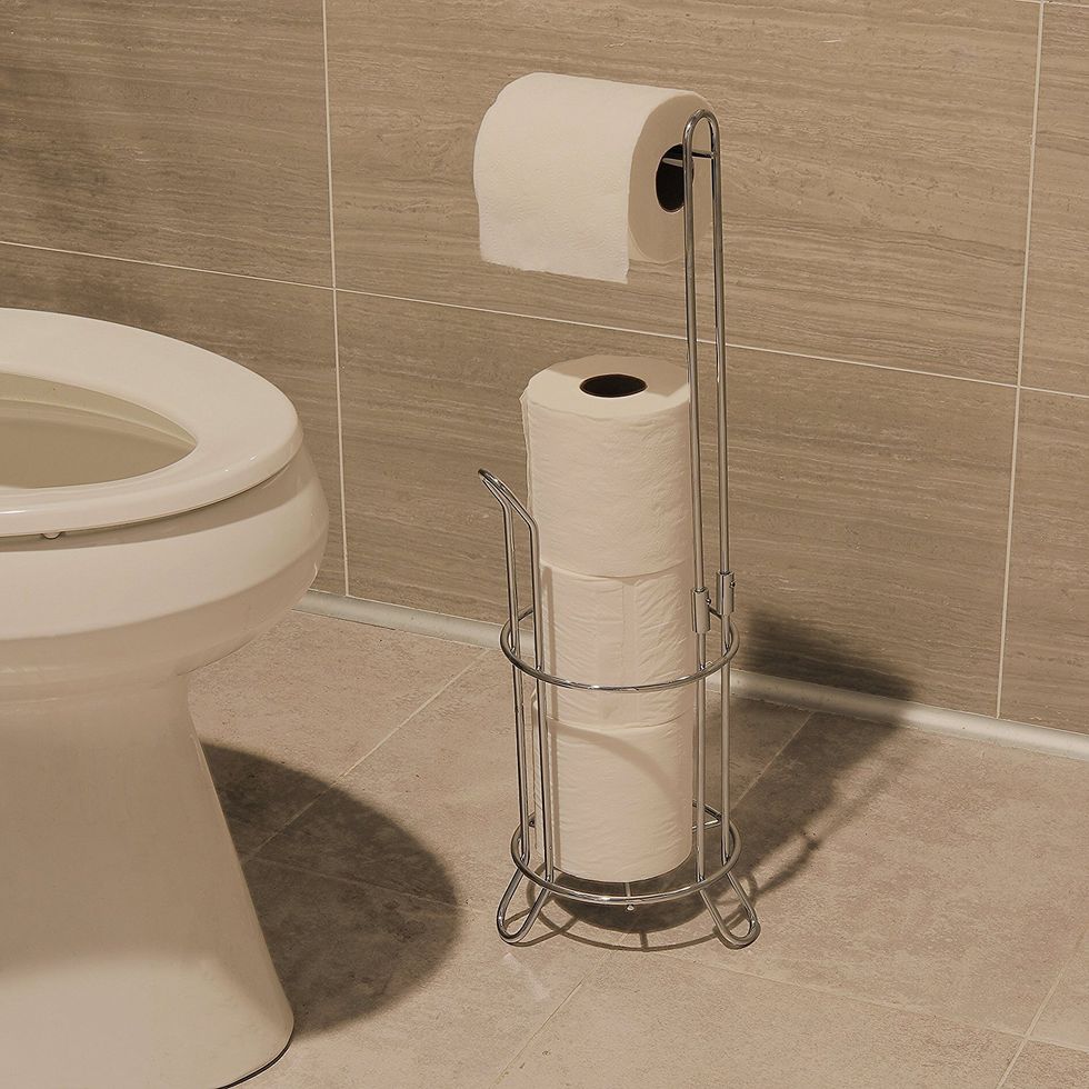 (Or reading materials.) If your bathroom doesn't have a lot of storage, this thin rack is the perfect solution. It can fit between your sink and the toilet and provide much-needed additional storage to just about any bathroom.You Can Change This Toilet Paper Holder with One Hand!