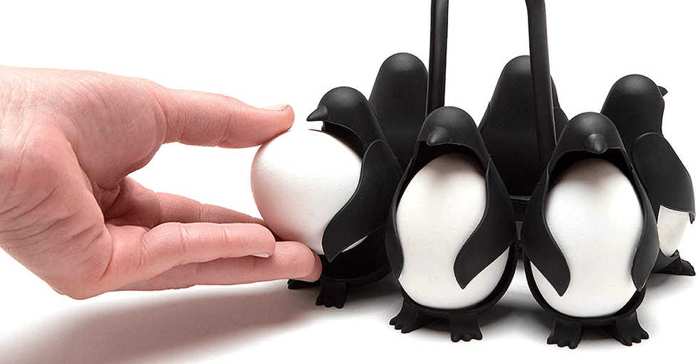 Hardboiled eggs are arguably the best snack - they're portable, tasty and full of satiating protein. But cooking them can kind of be a pain, especially if they bump into each other and crack in the rapidly boiling water. Solution: this penguin egg cooker that holds six eggs in soft silicone to protect them while they're cooking, and stores them neatly in the fridge when they're done! Simply load the penguin "bellies" with eggs and the work's basically done for you. Genius and adorable!