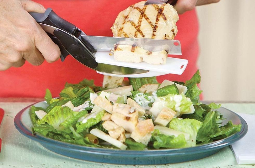 This Clever Cutter 2-in-1 Knife & Cutting Board lets you cut up meat, fruit, or veggies in one easy step. Where has this thing been all my life?!