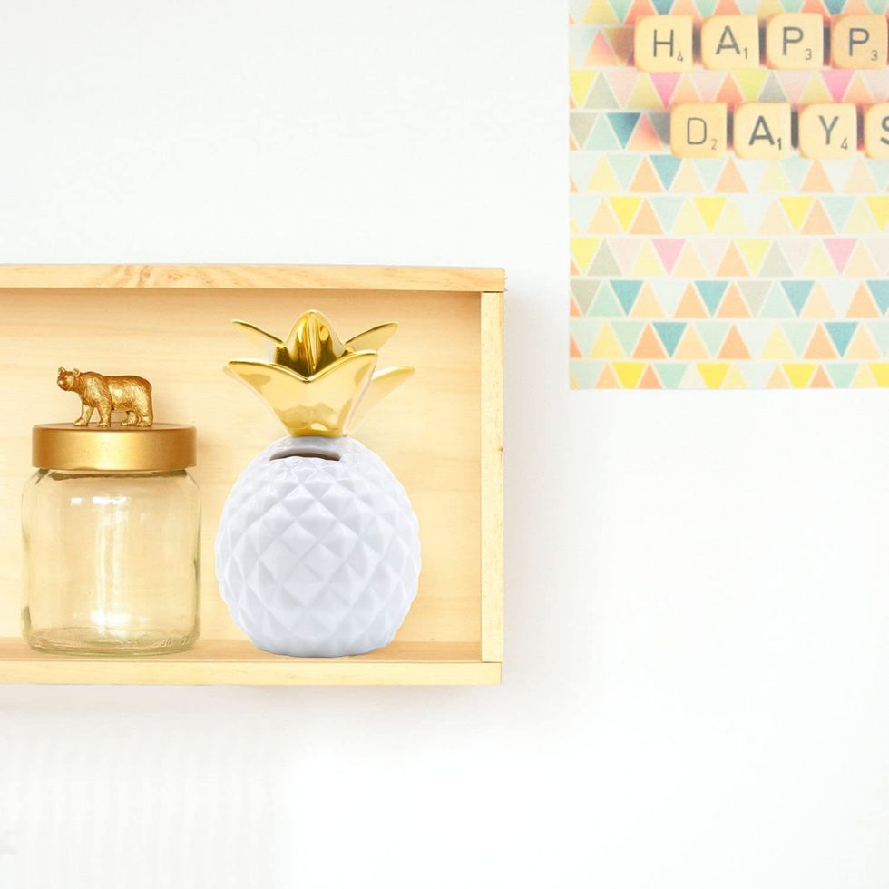 It seems as soon as my girls get so much as a dollar in their hot little hands they're scheming ways to spend it as soon as possible. Maybe if they had this cute pineapple bank with golden leaves they'd consider saving some of it? This is the perfect little addition to a nursery or kids' room since it doubles as a decoration.